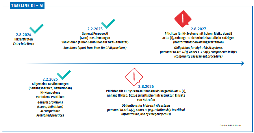 Aber sobald KI als Sicherheitsbauteil im Aufzug zum Einsatz kommt, gelten viele zusätzliche Regeln für das Konformitätsbewertungsverfahren, die unbedingt zu beachten sind. Scharf geschaltet werden diese Pflichten – spätestens – zum 2. August 2027, für manche Einsatzbereiche aber schon zum 2. August 2026.